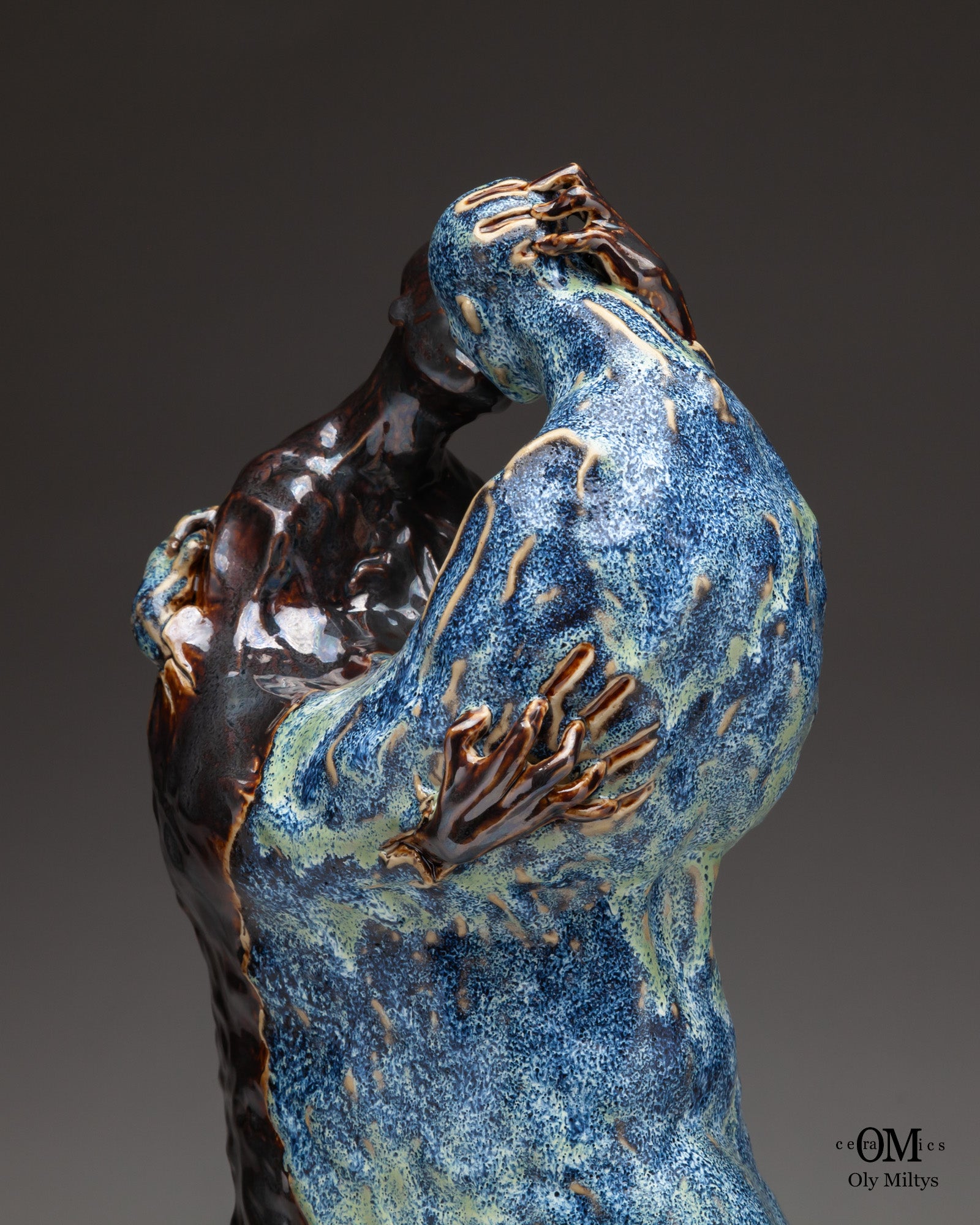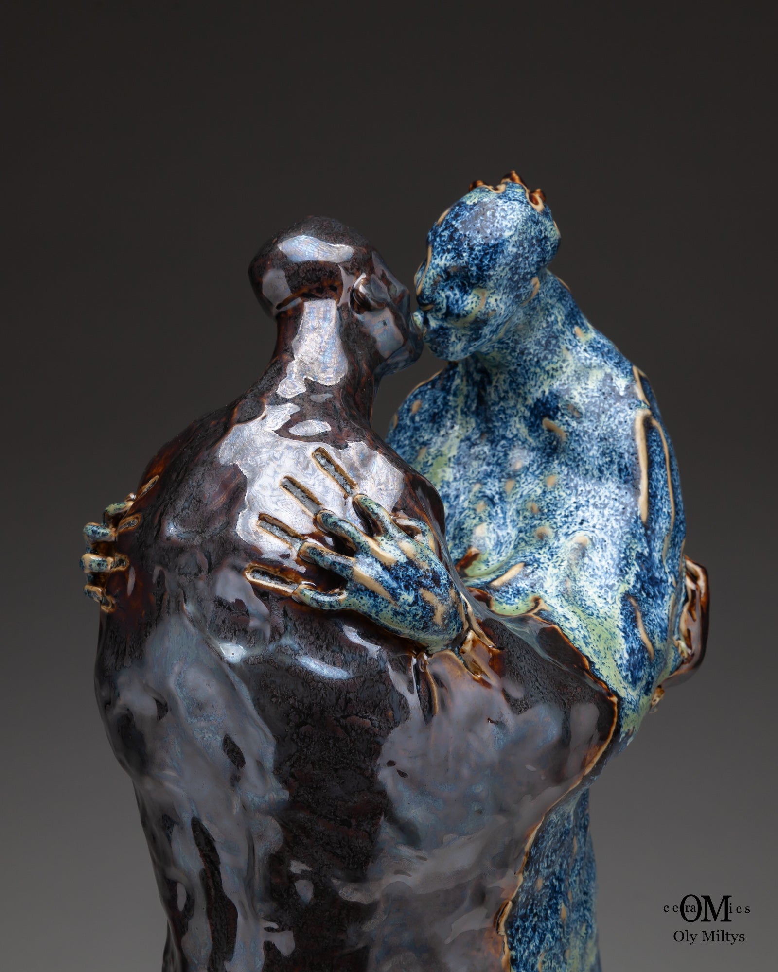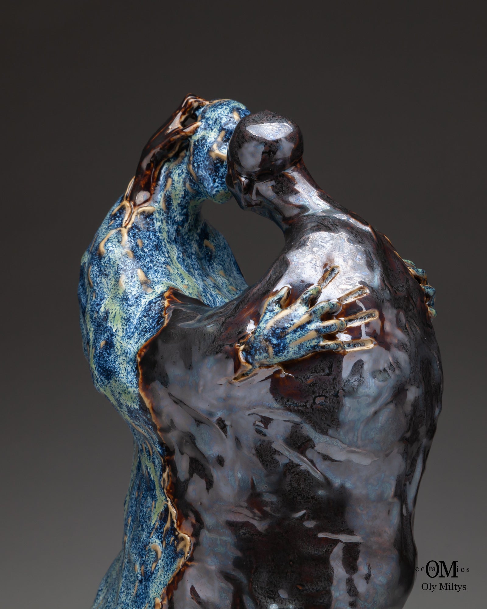 One figure, glazed in cool blues with touches of green, feels like a flowing current: fluid, elusive. The other — deep and dark as night. They don’t merge, but they touch — gently, densely, with quiet intensity. It’s not a collision, but a dissolving of boundaries. Intimacy not as a flash, but as a calm surrender.