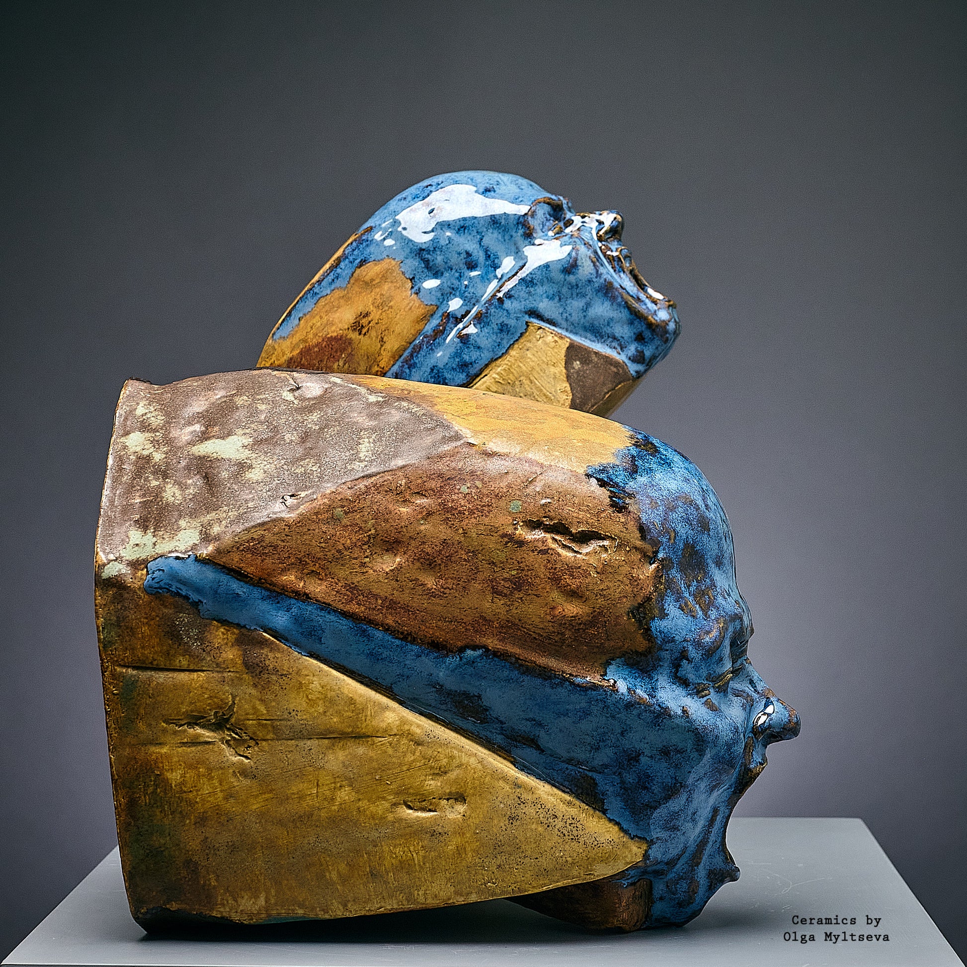 The ethereal shades of blue on their faces seamlessly merge with the earthy tones at their base—a poignant symbol of the unbreakable bond between our spiritual aspirations and our deeply rooted human nature...