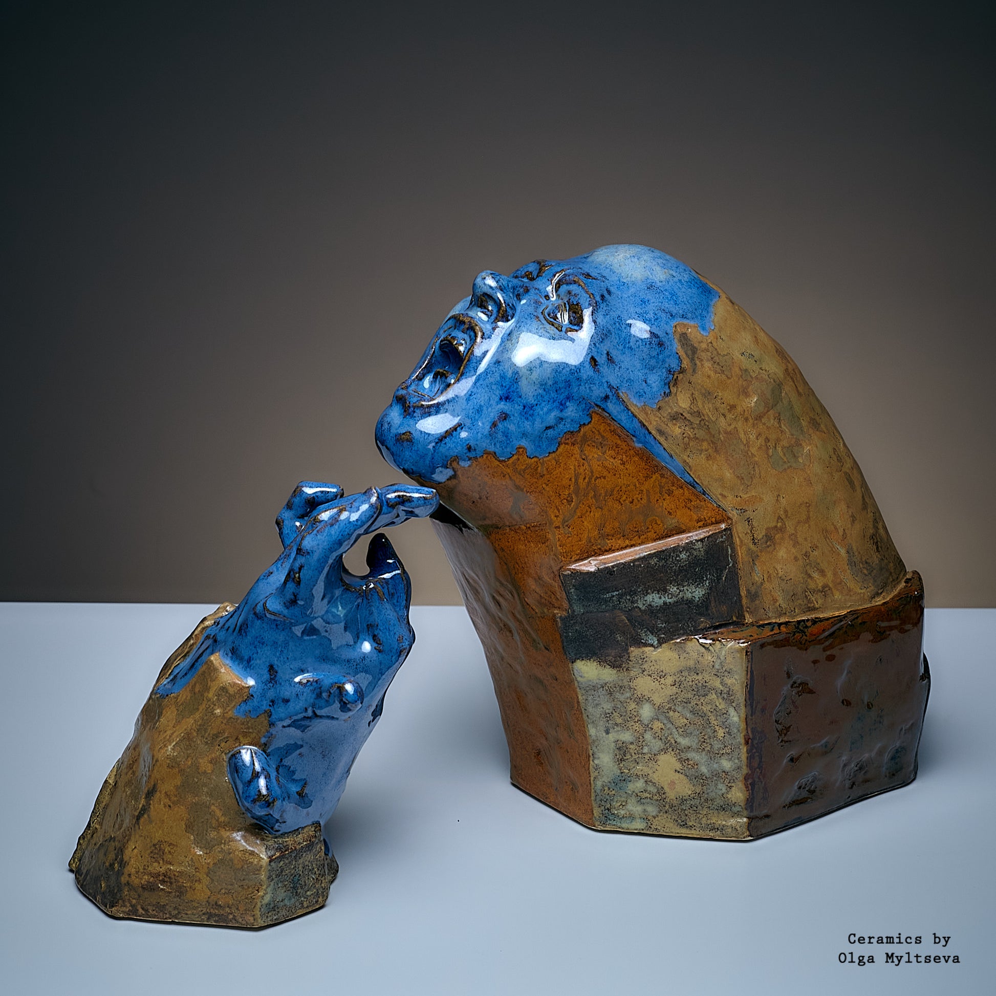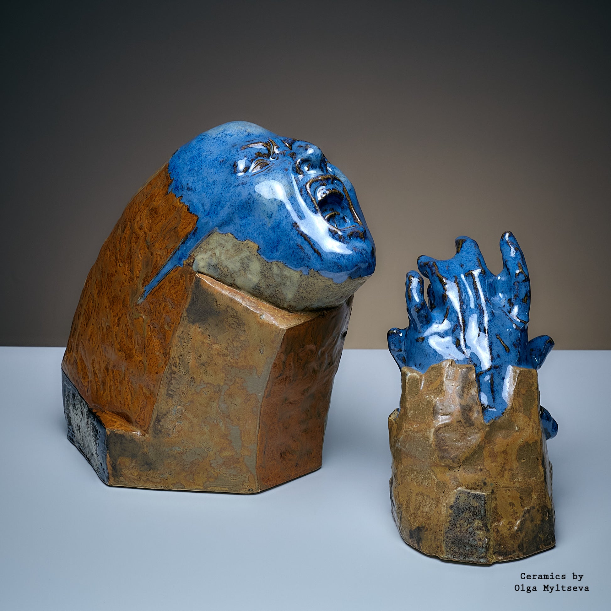 The ethereal shades of blue on their faces seamlessly merge with the earthy tones at their base—a poignant symbol of the unbreakable bond between our spiritual aspirations and our deeply rooted human nature...