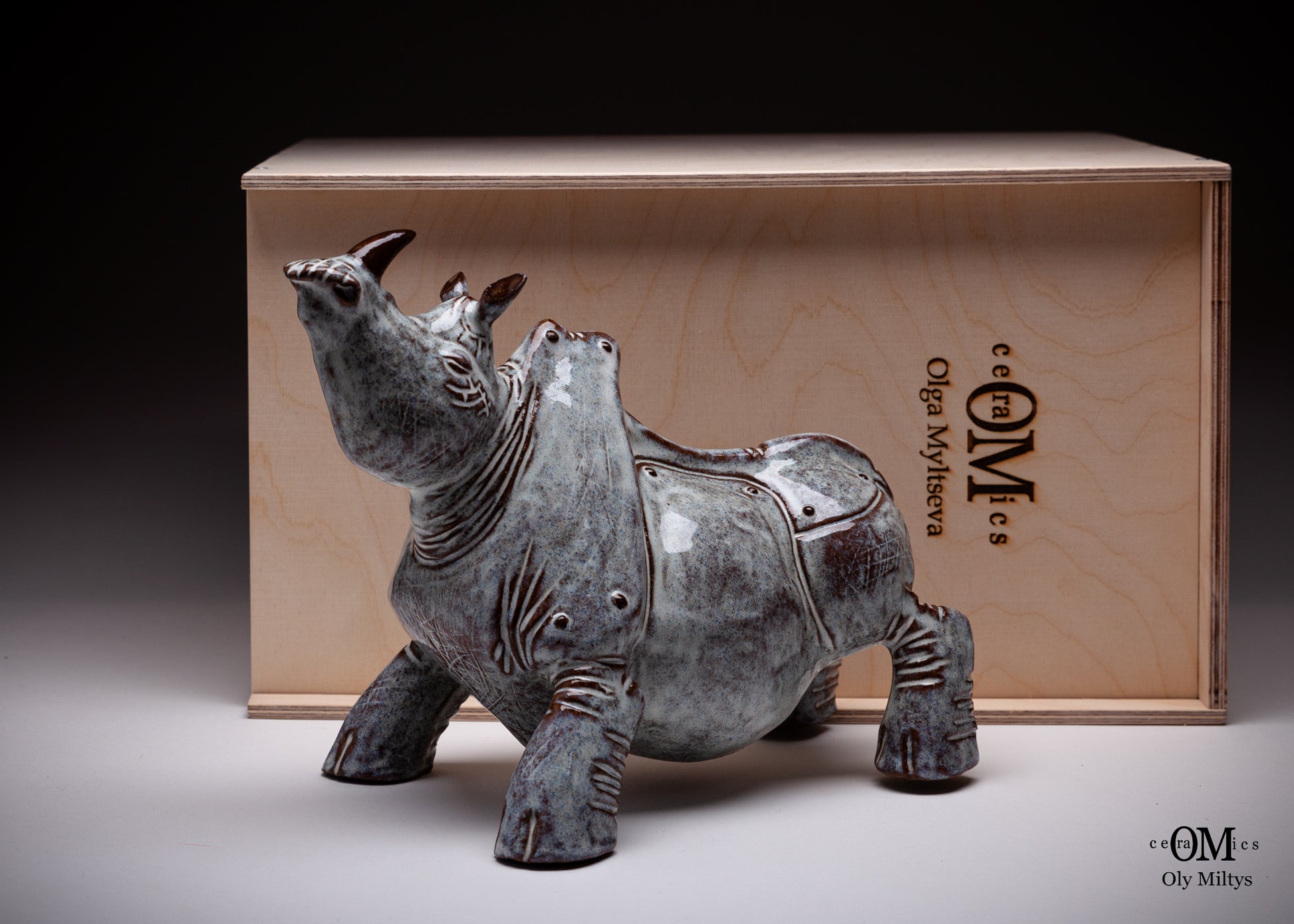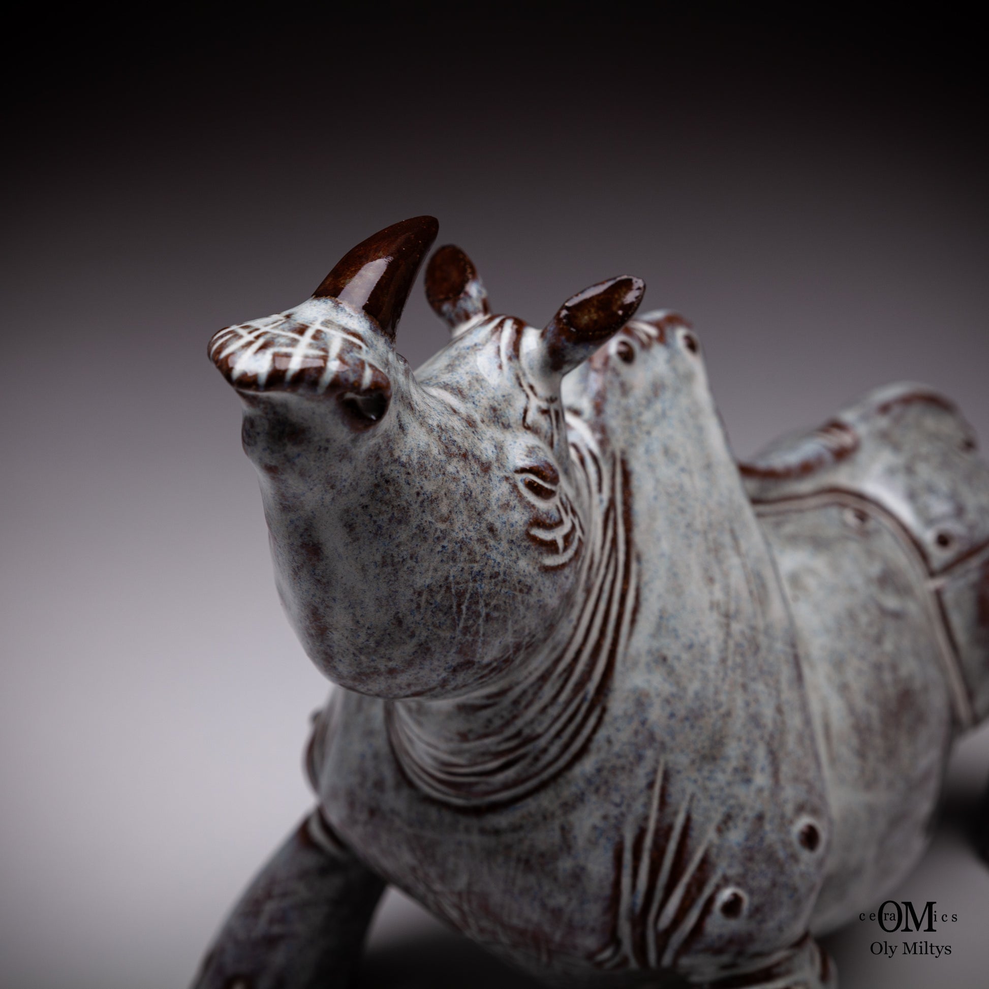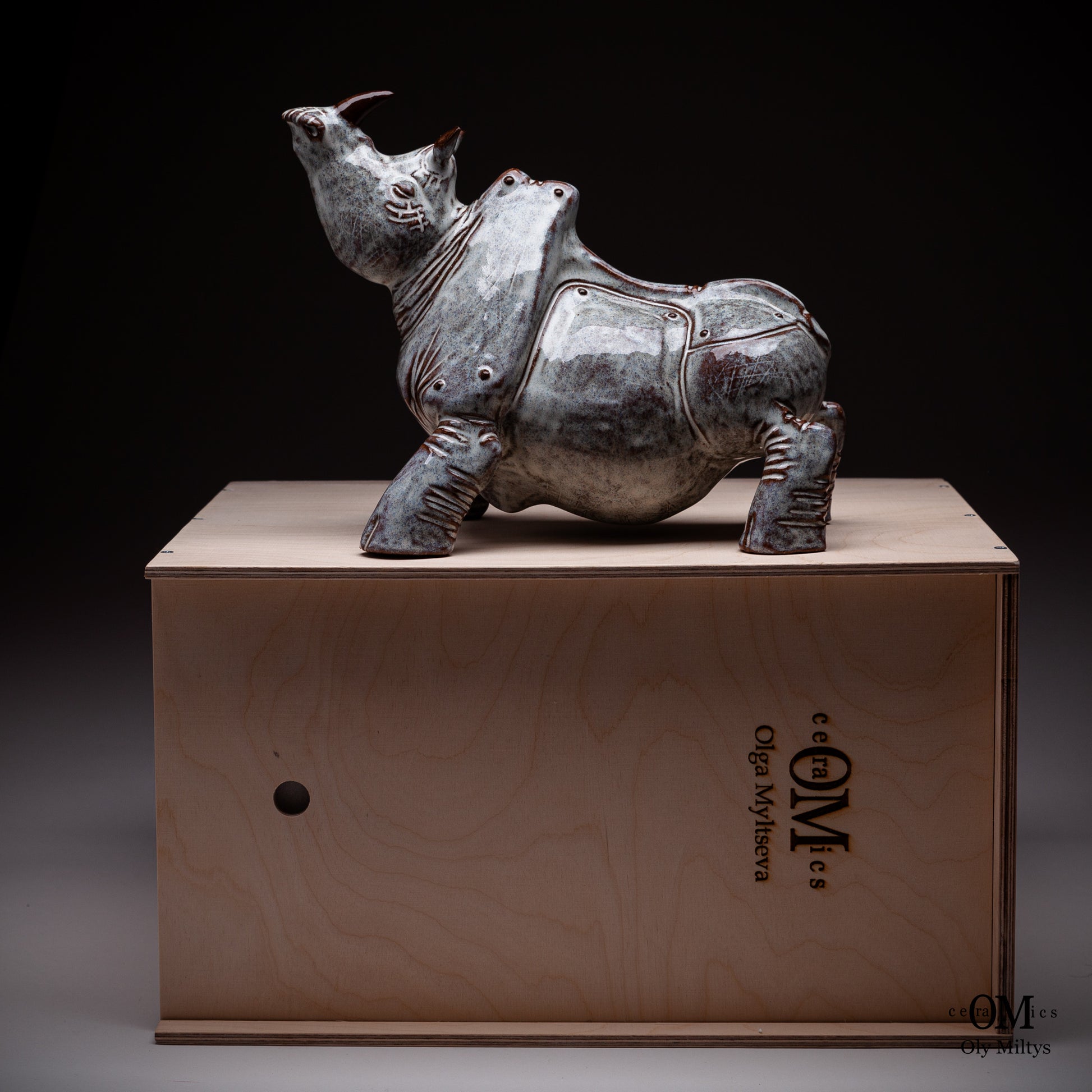 This ceramic rhinoceros sculpture is part of a unique series that explores the image of ancient power and vulnerability. The figure of the rhinoceros, one of the most powerful and monumental animals, is presented here in a form that combines strength with the delicate, almost ephemeral quality of ceramics.