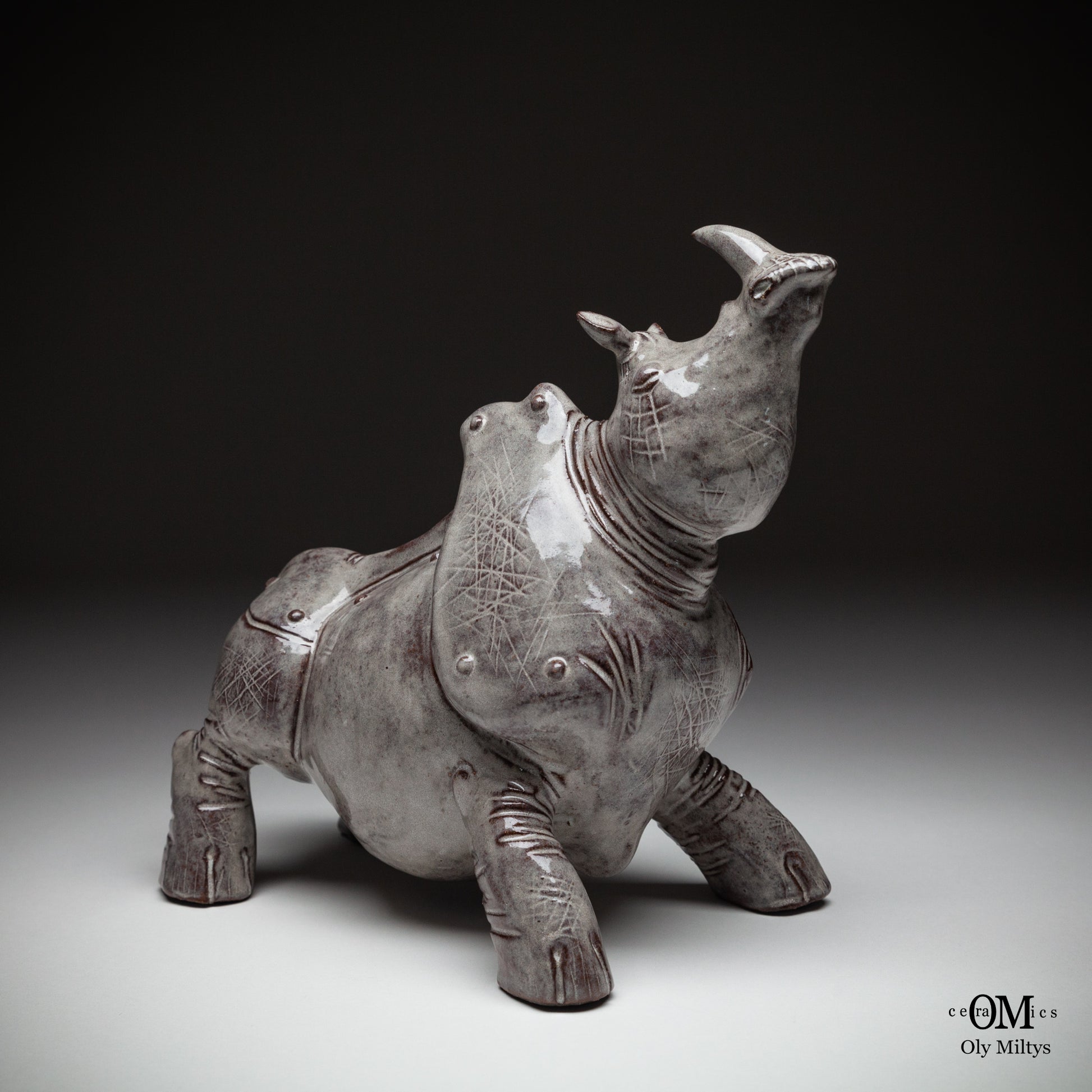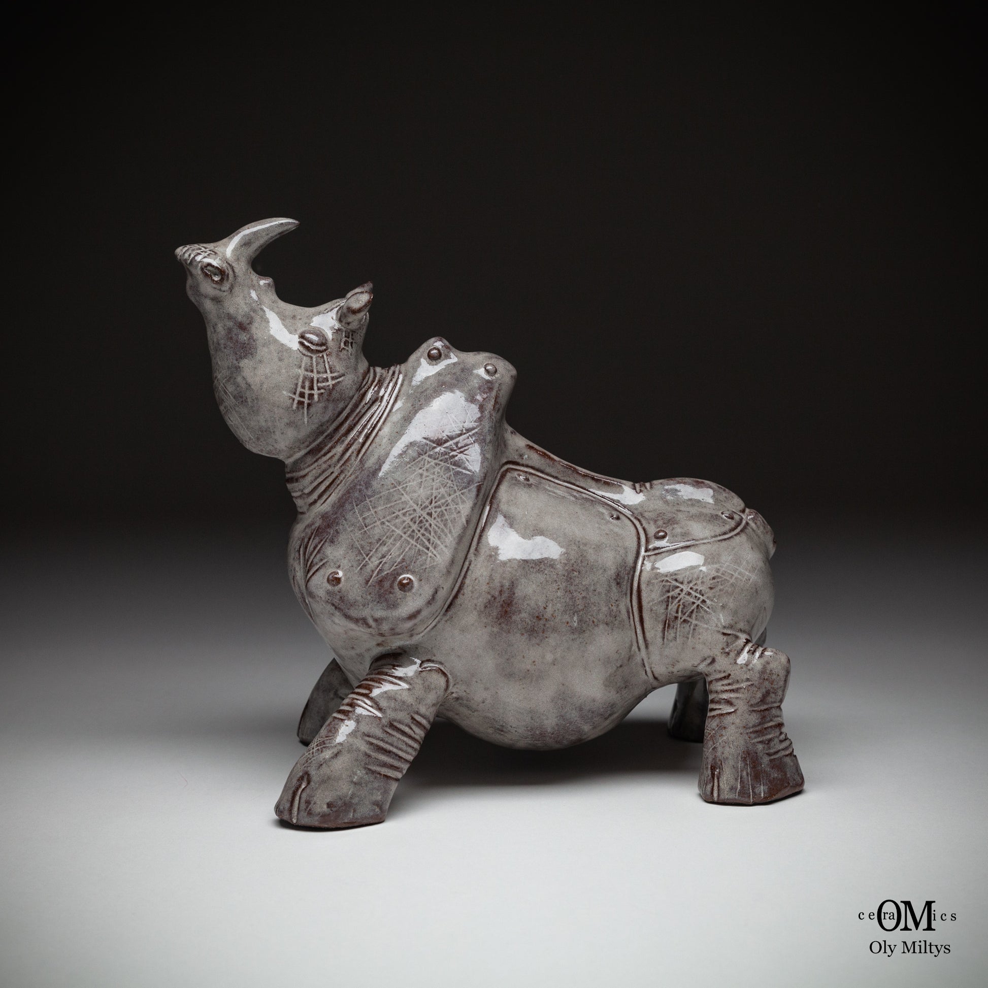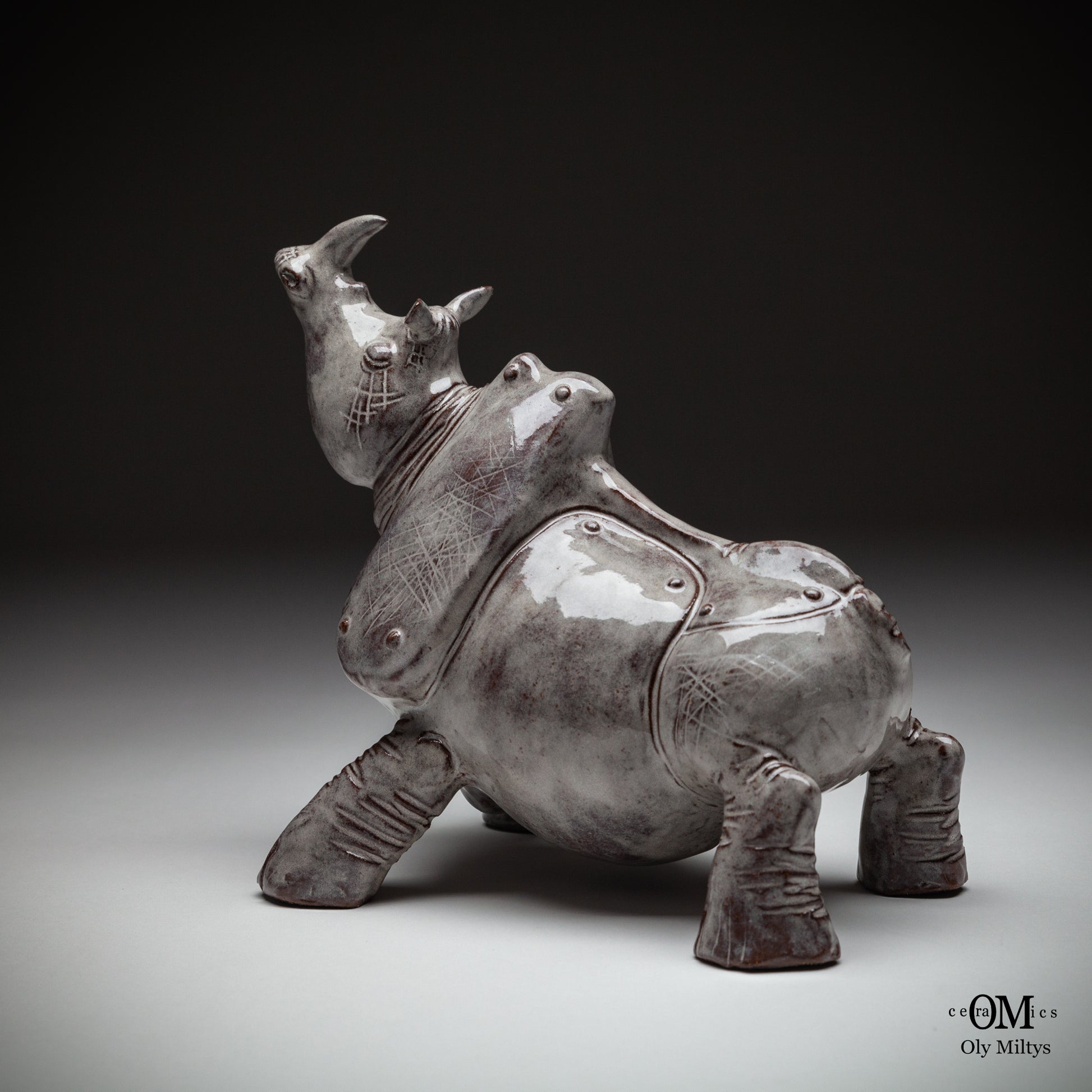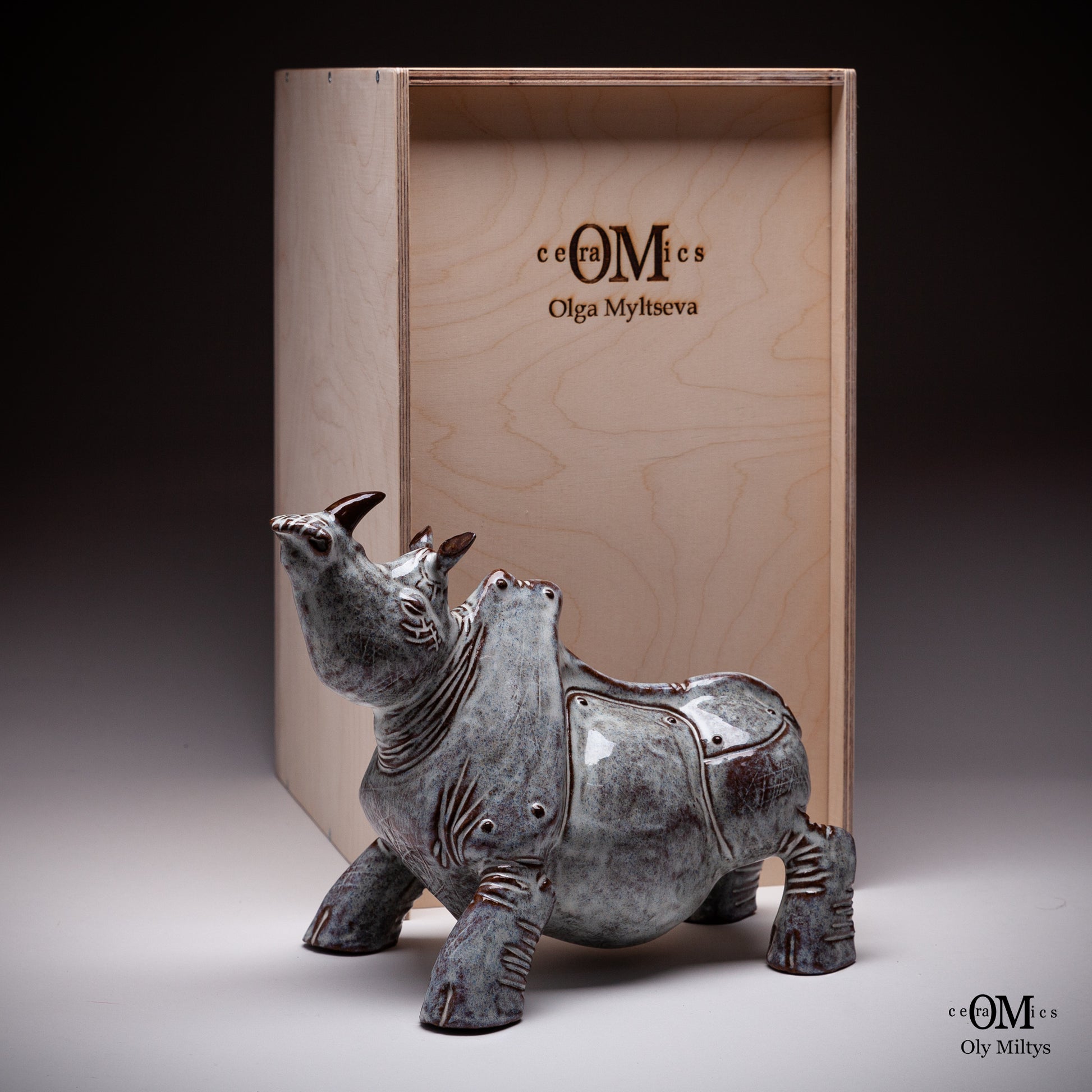 This ceramic rhinoceros sculpture is part of a unique series that explores the image of ancient power and vulnerability. The figure of the rhinoceros, one of the most powerful and monumental animals, is presented here in a form that combines strength with the delicate, almost ephemeral quality of ceramics.