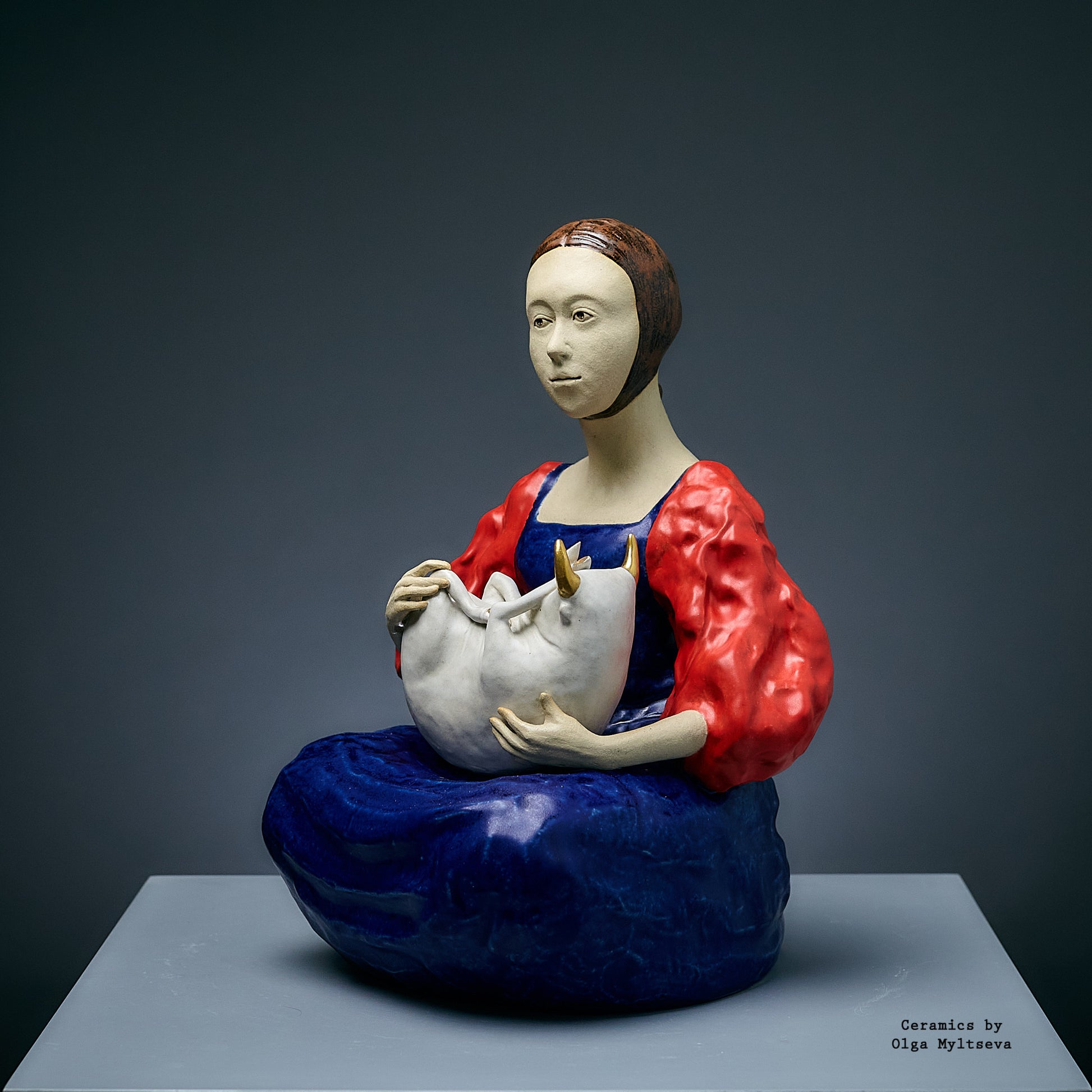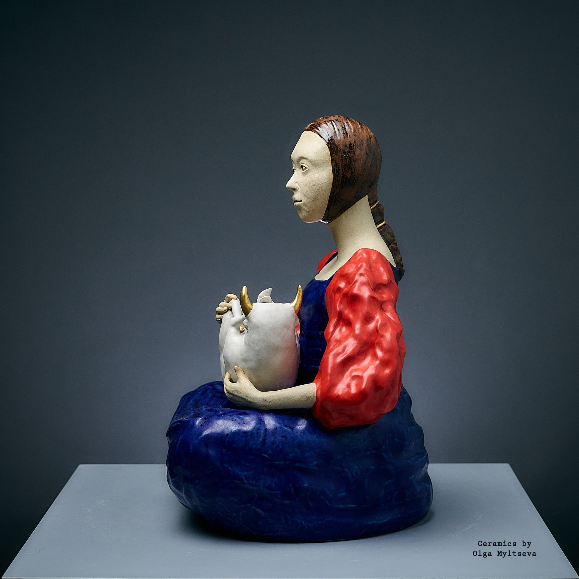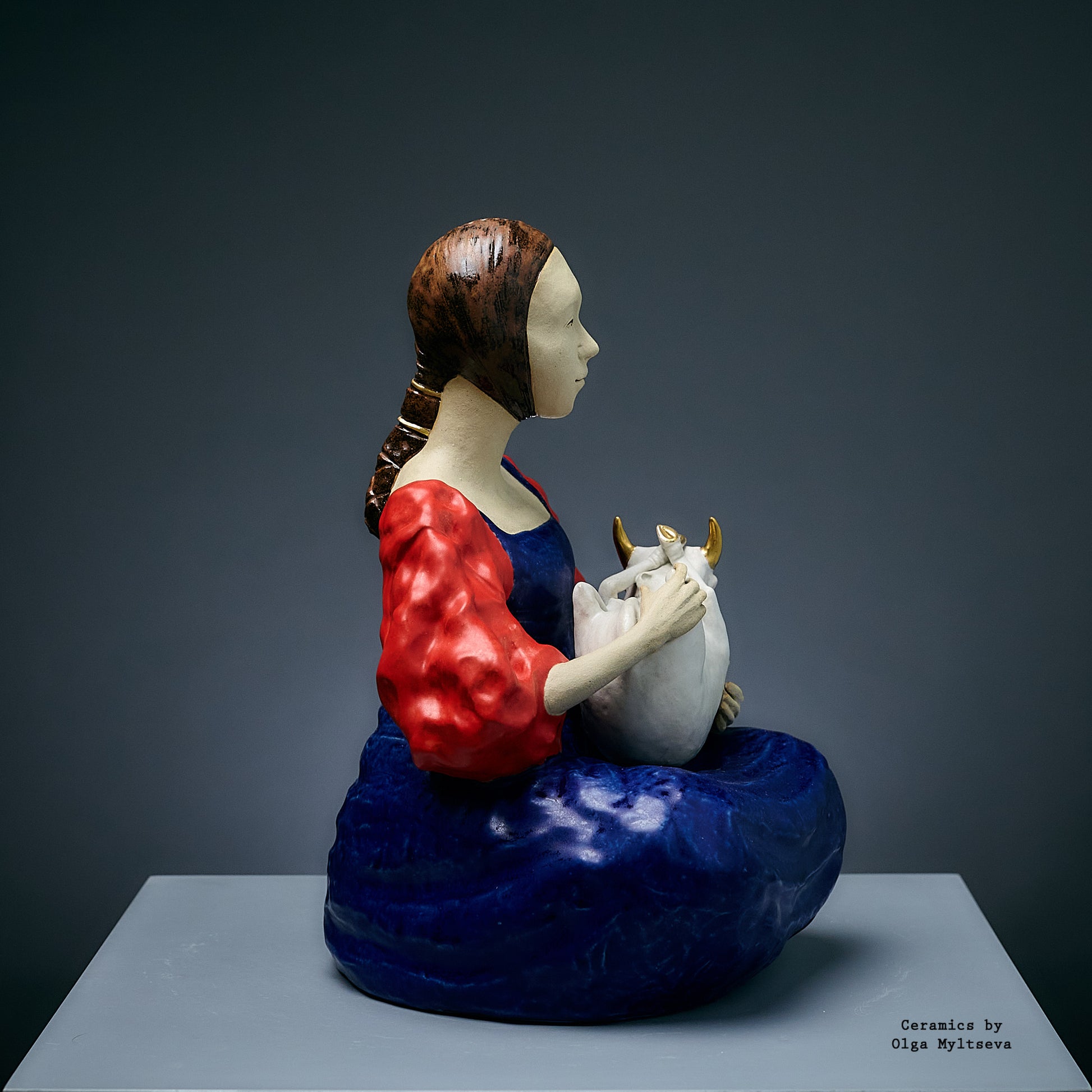 This sculpture is a dialogue with classical art and contains references to three well-known classical works, but most importantly, it continues a series of interpretations of the myth of the abduction of Europa. Here, Europa and Zeus (depicted as a calf with golden horns) take on new roles, revealing the complexity and diversity of relationships between men and women, changing roles throughout life, and the deep connection underlying this story.