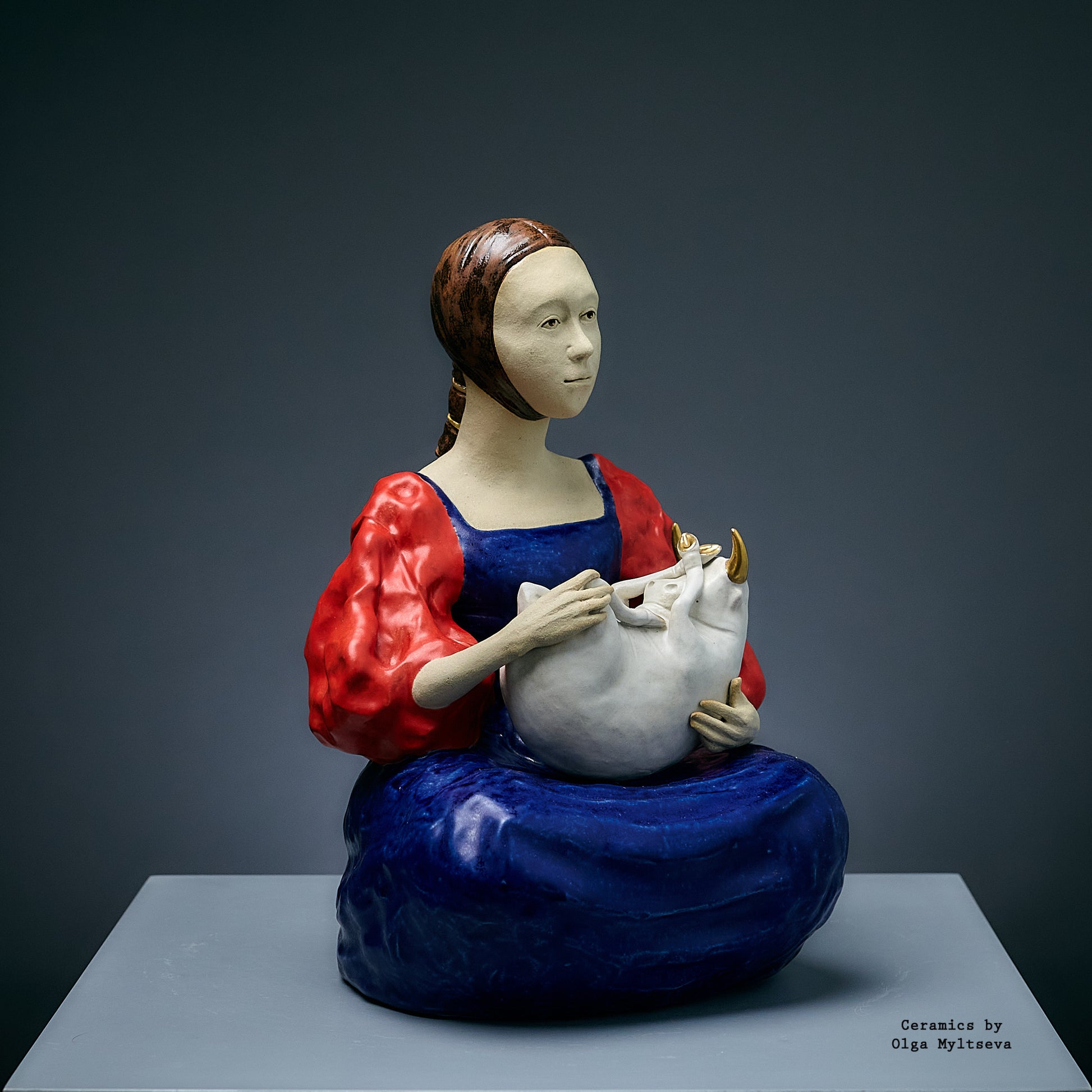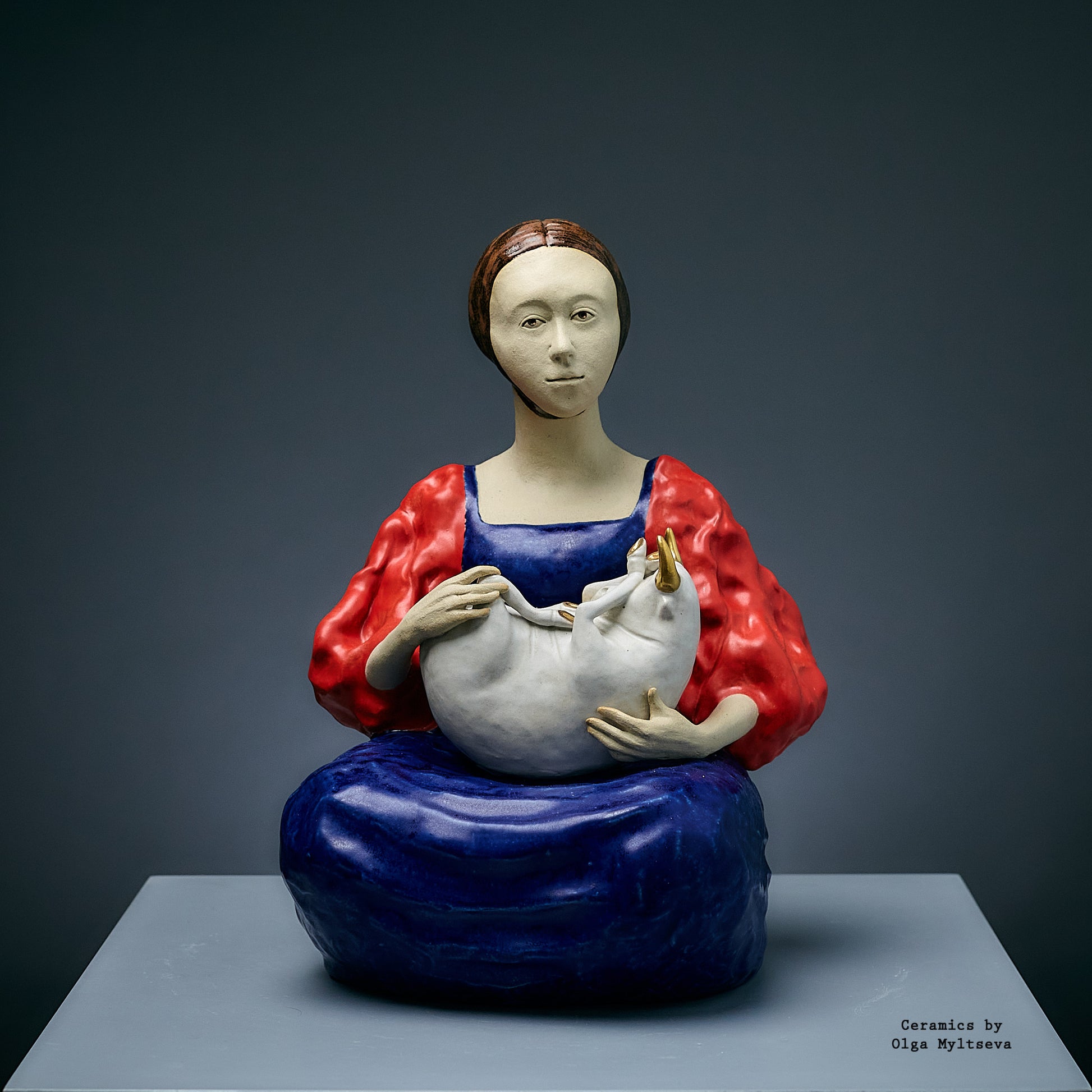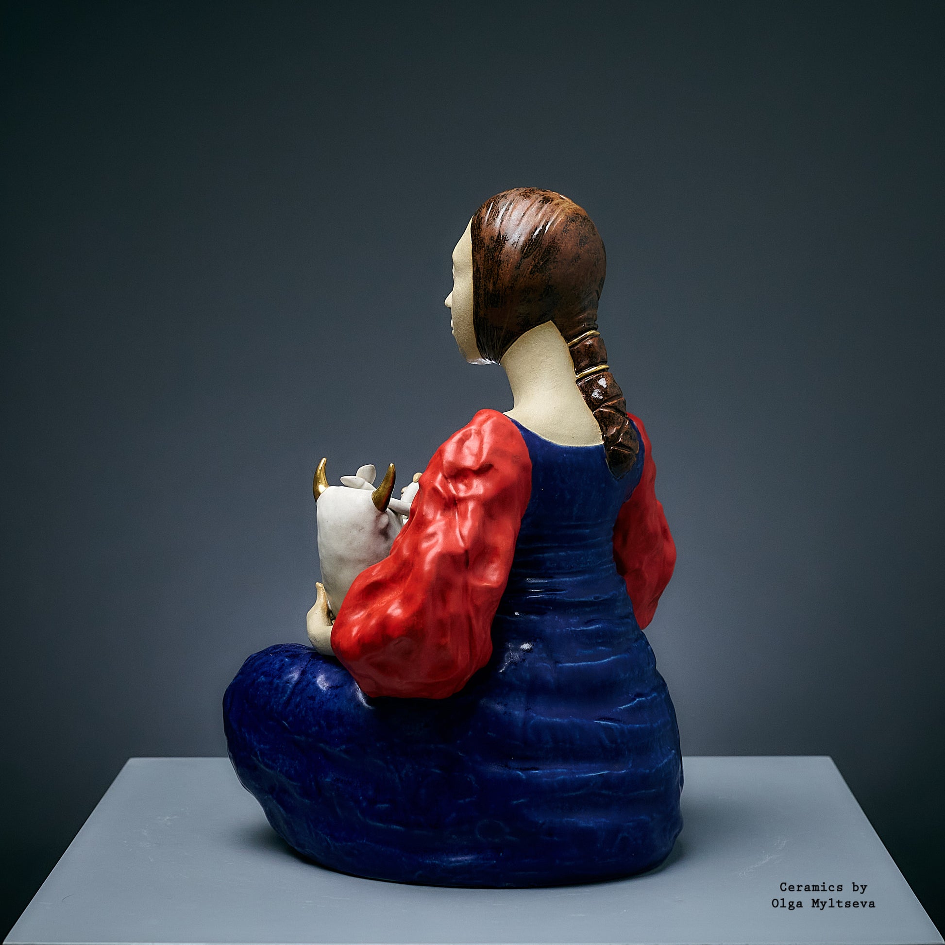This sculpture is a dialogue with classical art and contains references to three well-known classical works, but most importantly, it continues a series of interpretations of the myth of the abduction of Europa. Here, Europa and Zeus (depicted as a calf with golden horns) take on new roles, revealing the complexity and diversity of relationships between men and women, changing roles throughout life, and the deep connection underlying this story.