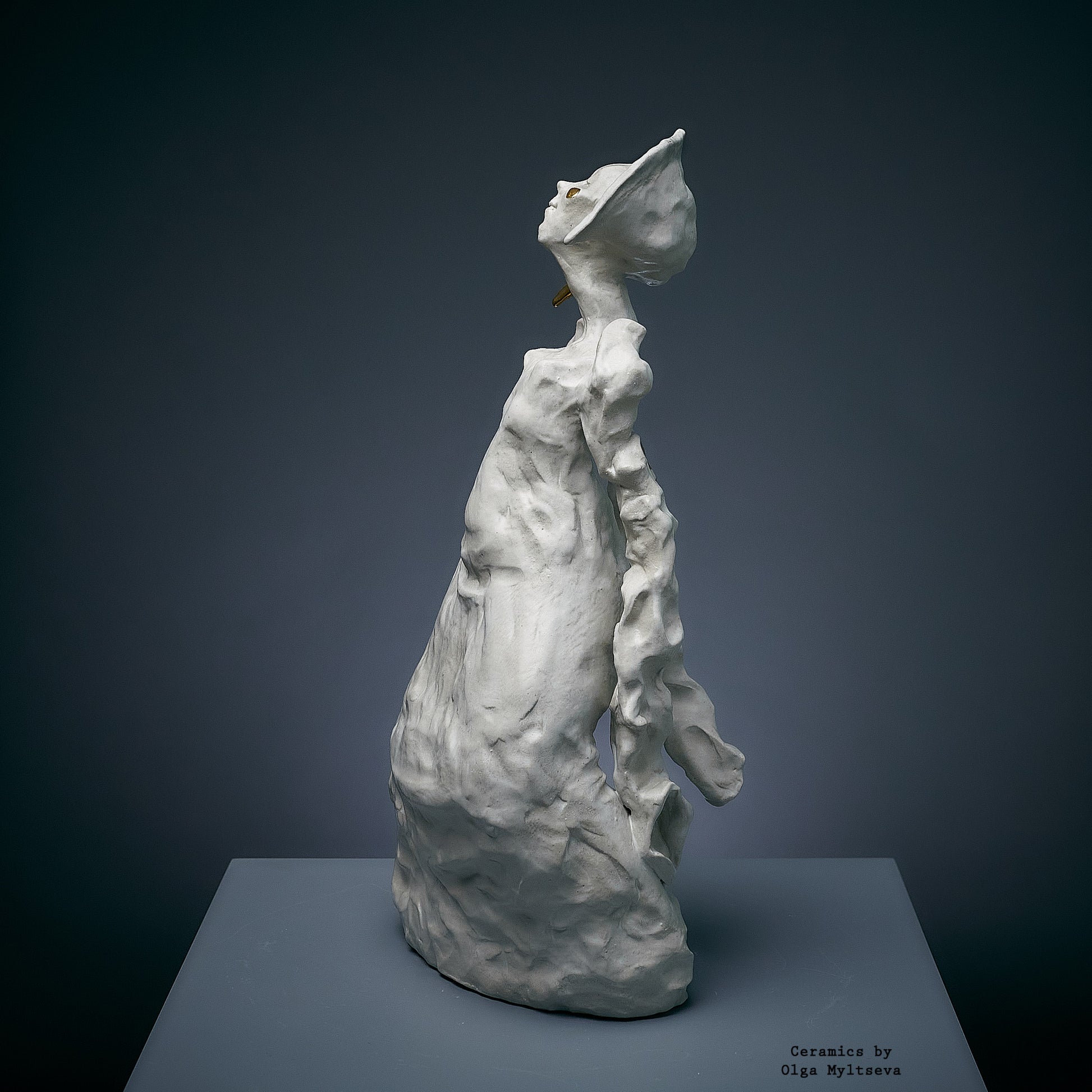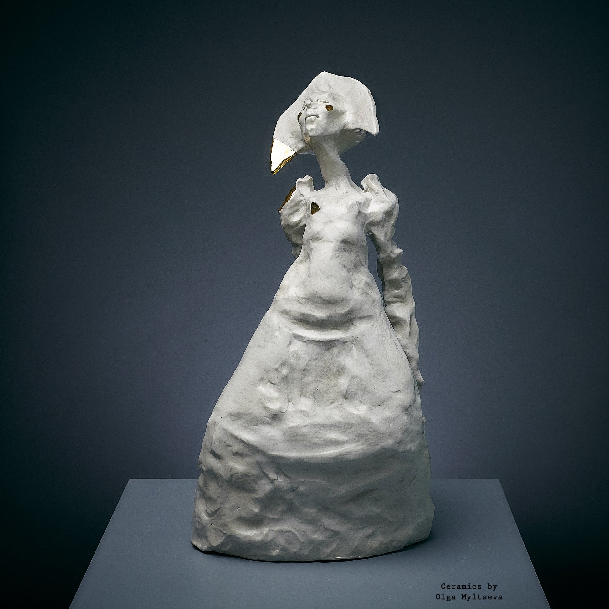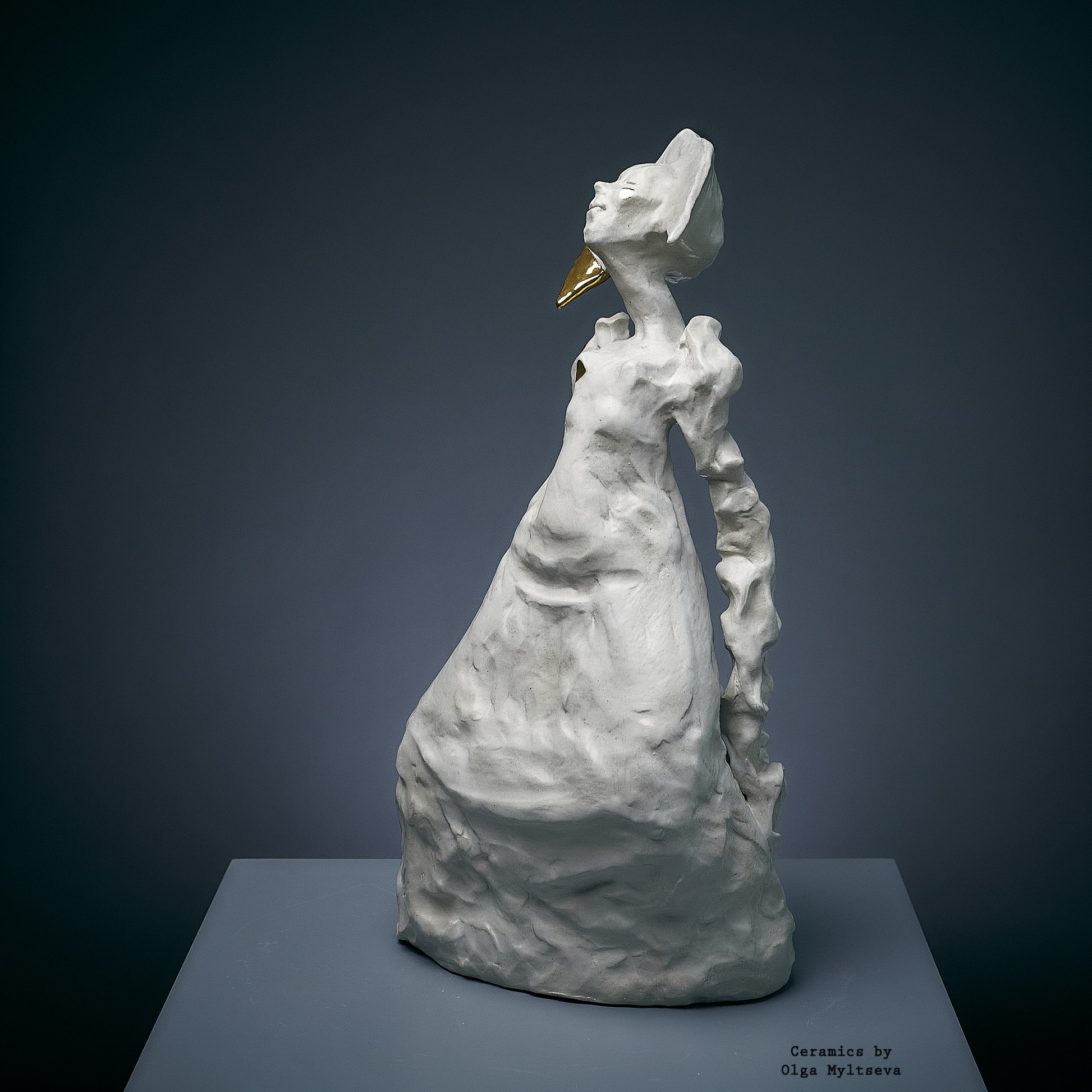 Njena forma zrači lakoćom i snažnom individualnošću, isticući unutrašnju snagu skrivenu iza krhkog eksterijera. Bela boja i zlatni detalji stvaraju kontrast, simbolizujući nevidljivu ali jaku vezu sa kulturnim korenom i tradicijama. Krivudave linije forme i izraz na licu prenose težnju lika ka nezavisnosti, dok istovremeno zadržava uzdržanu eleganciju. Ova skulptura privlači pažnju svojom originalnošću i dubokom simbolikom.