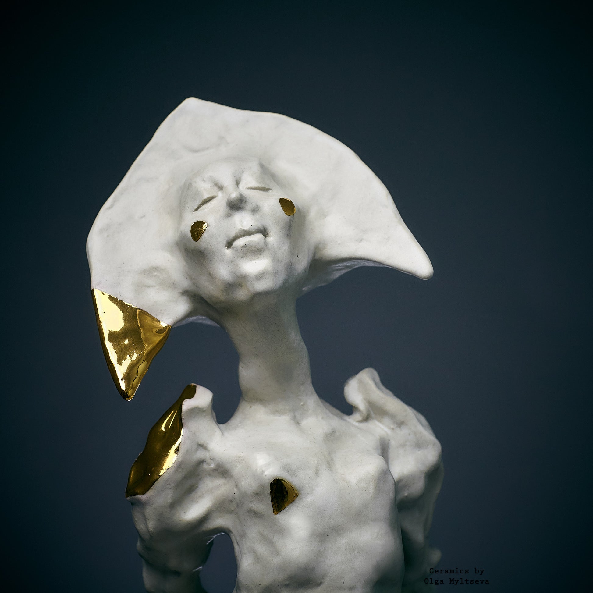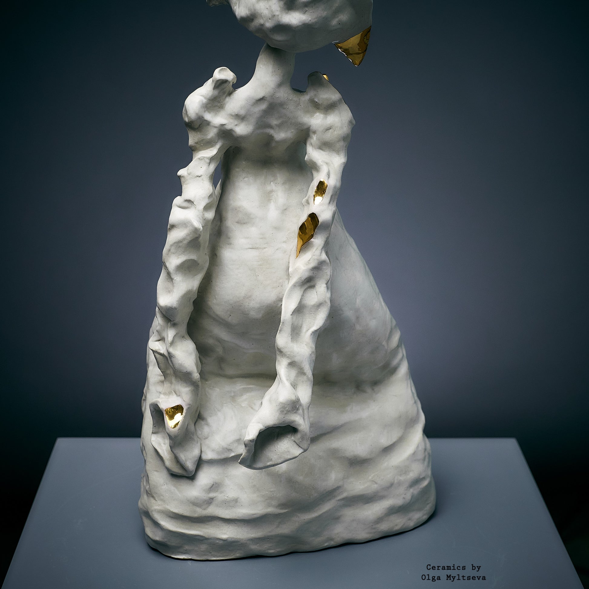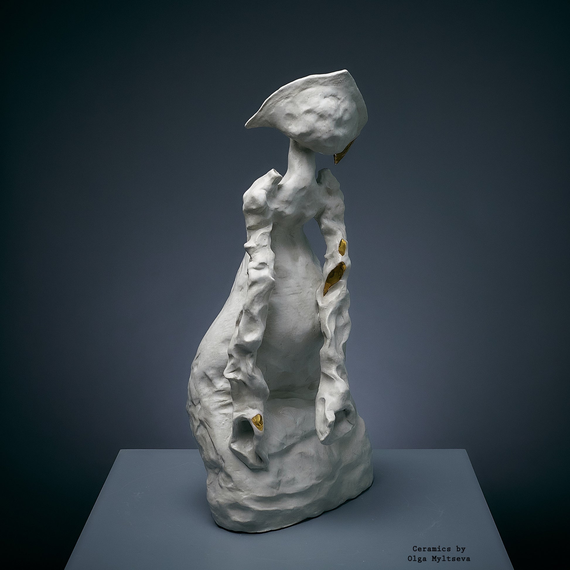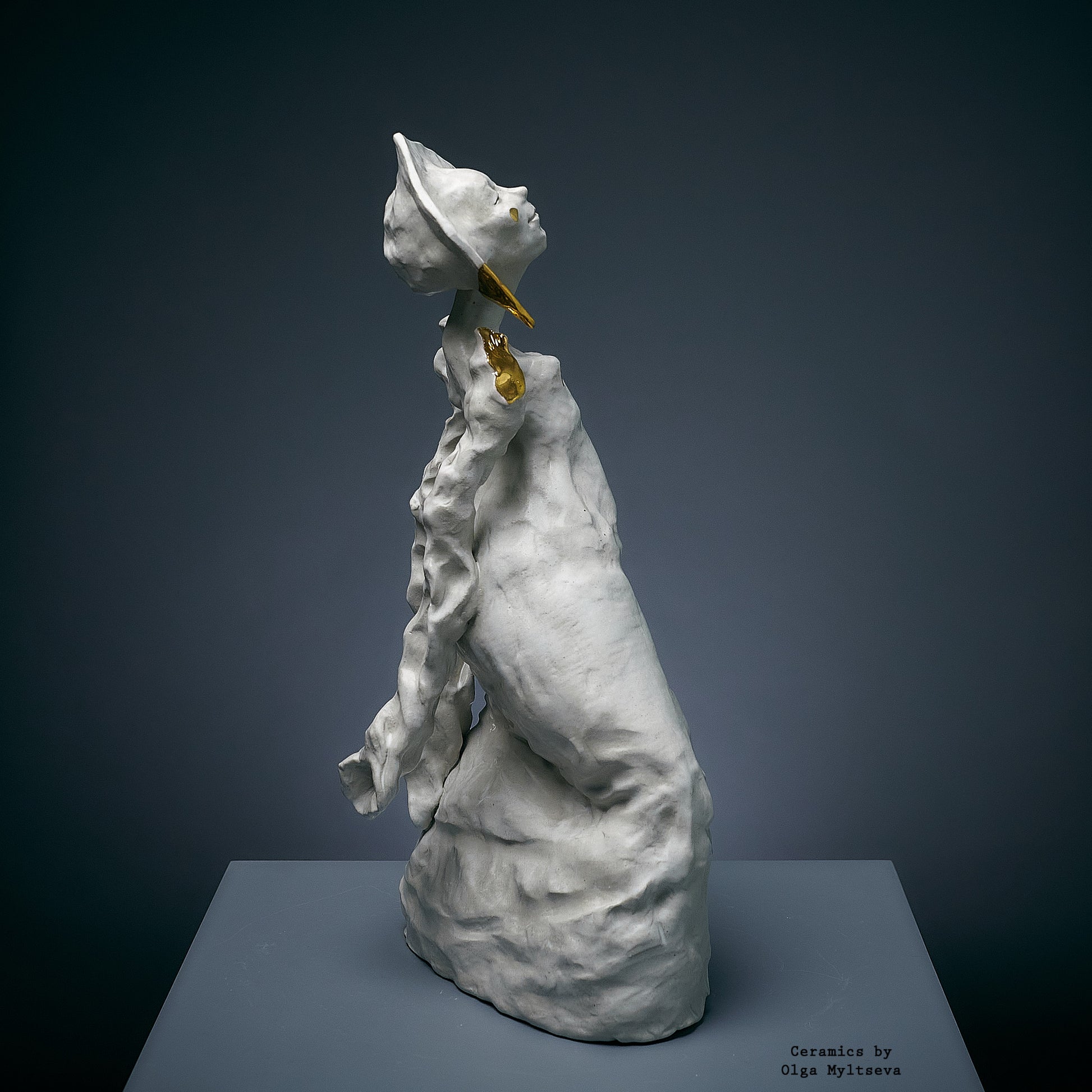 Njena forma zrači lakoćom i snažnom individualnošću, isticući unutrašnju snagu skrivenu iza krhkog eksterijera. Bela boja i zlatni detalji stvaraju kontrast, simbolizujući nevidljivu ali jaku vezu sa kulturnim korenom i tradicijama. Krivudave linije forme i izraz na licu prenose težnju lika ka nezavisnosti, dok istovremeno zadržava uzdržanu eleganciju. Ova skulptura privlači pažnju svojom originalnošću i dubokom simbolikom.